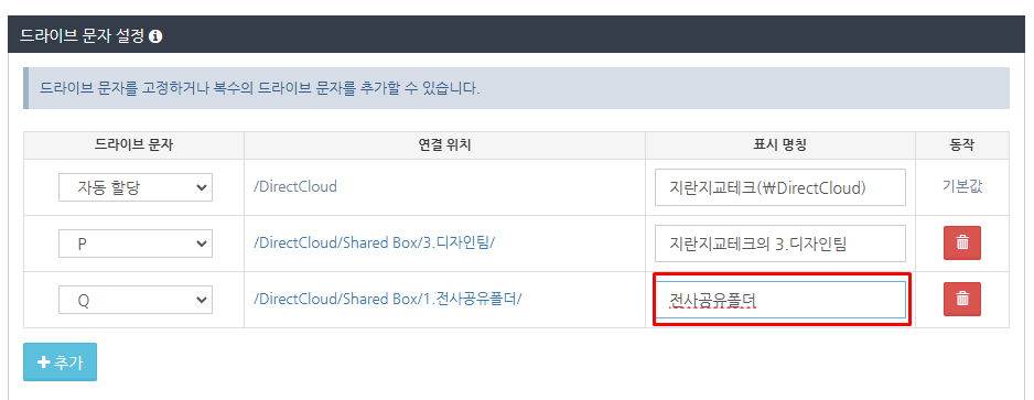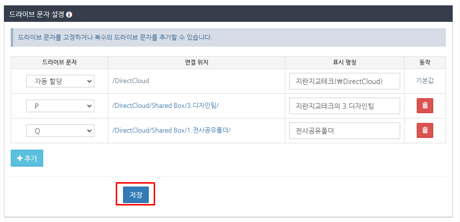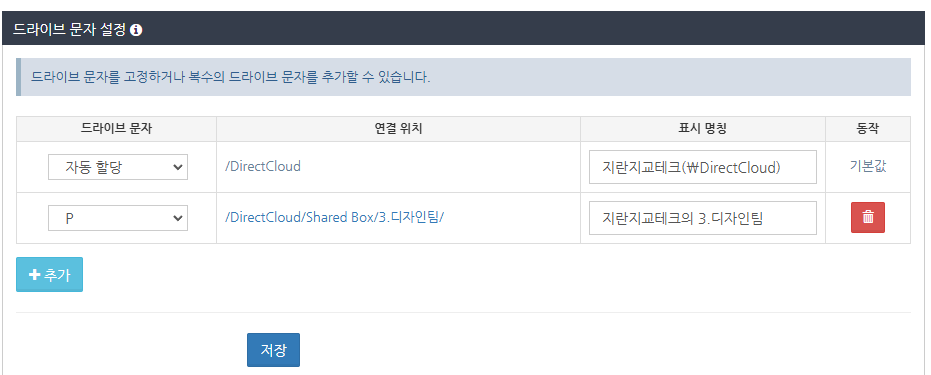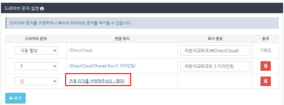 루트 폴더 경로인 '/DirectCloud/'의 드라이브 문자는 기본적으로 '자동 할당'으로 설정되어 있습니다.