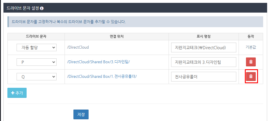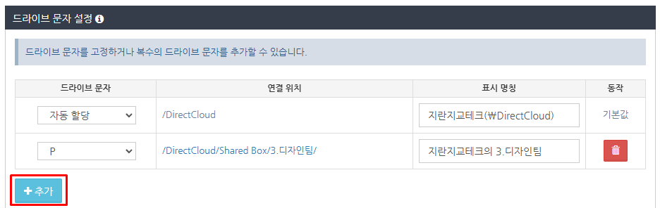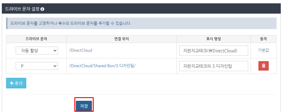본 매뉴얼의 절차에 따라 드라이브 문자를 지정한 경우, 사용자 페이지에서는 DirectCloud 드라이브에서 폴더 경로에 할당된 드라이브 문자를 확인하는 방법의 절차로 드라이브 문자를 변경할 수 없게 됩니다.