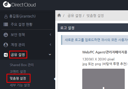 관리자 권한이 부여된 사용자는 관리자 페이지의 '공유 설정' 메뉴를 사용할 수 있습니다.