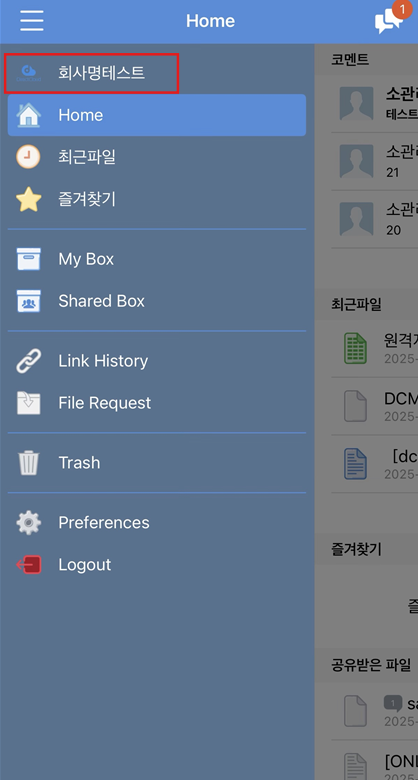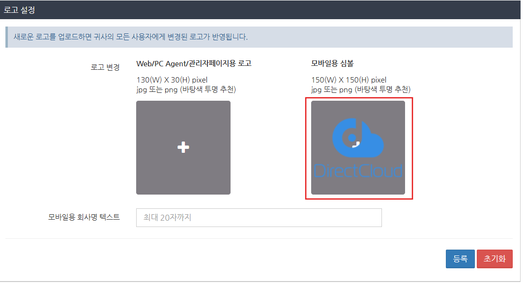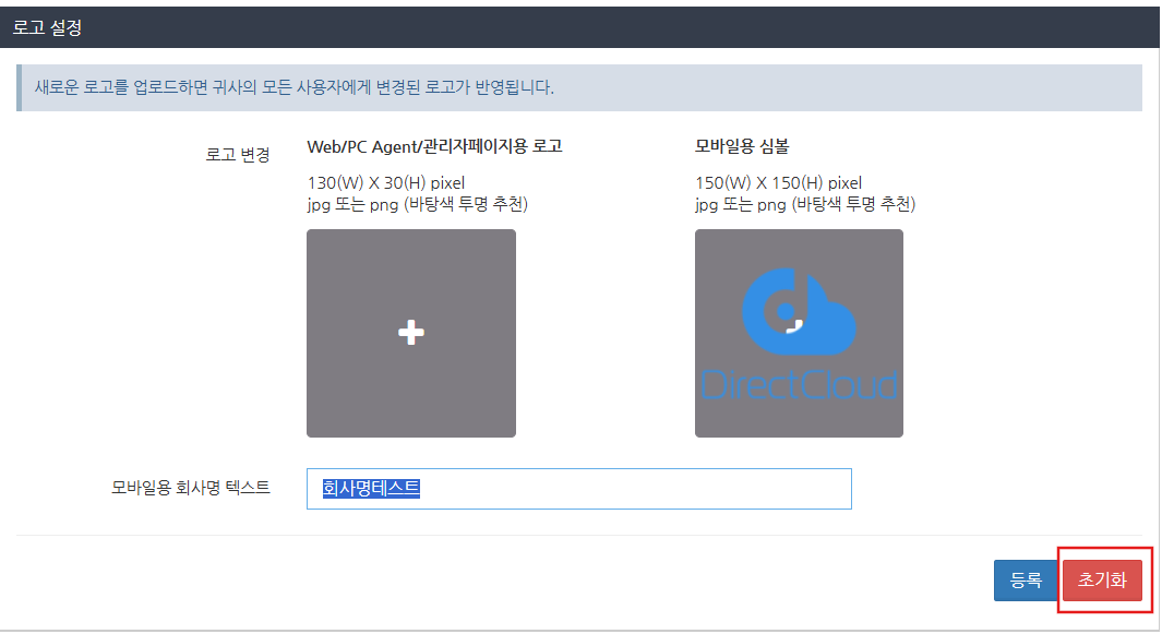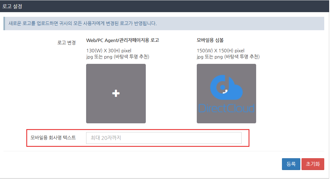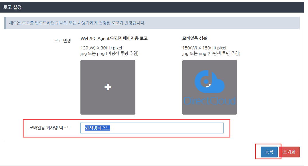 맞춤 로고 설정에서 '모바일용 회사명 텍스트에' 입력된 문자를 제거하고 등록 버튼을 클릭하세요. 회사 이름이 삭제되고 회사 이름이 초기 상태로 돌아갑니다.