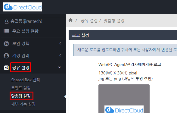 관리자 권한이 부여된 사용자는 관리자 페이지의 '공유 설정' 메뉴를 사용할 수 있습니다.
