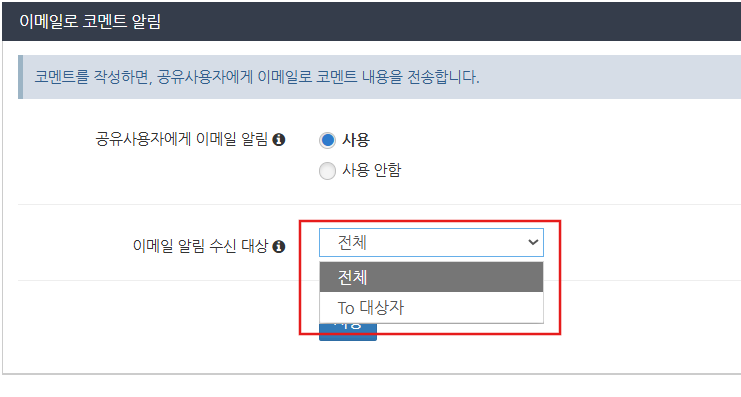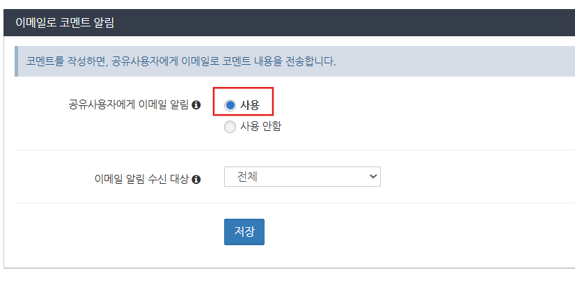 '이메일로 코멘트 알림' 설정에서 '공유사용자에게 이메일 알림'을 사용을 선택하고 저장 버튼을 클릭합니다.