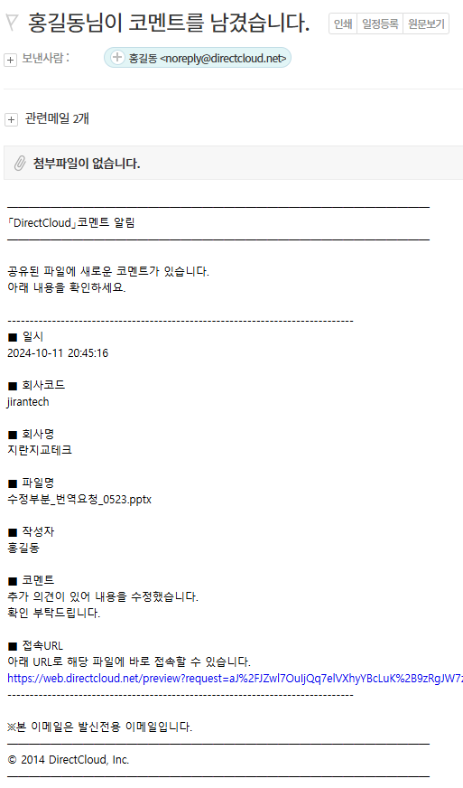 파일 코멘트 알림이 활성화된 경우 파일 코멘트가 추가되면 "○○ 님이 코멘트를 남겼습니다."라는 제목의 알림 메일이 전송됩니다.