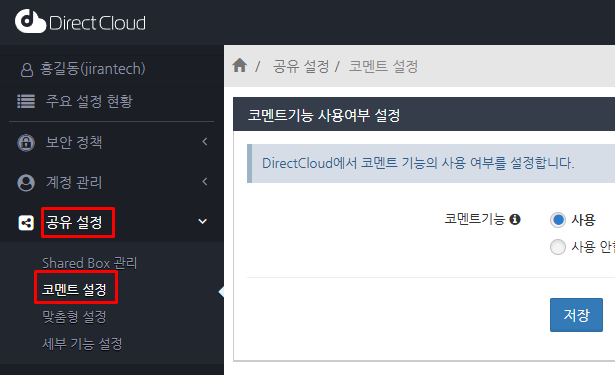 관리자 권한이 부여된 사용자는 관리자 페이지의 '공유 설정'을 사용할 수 있습니다.