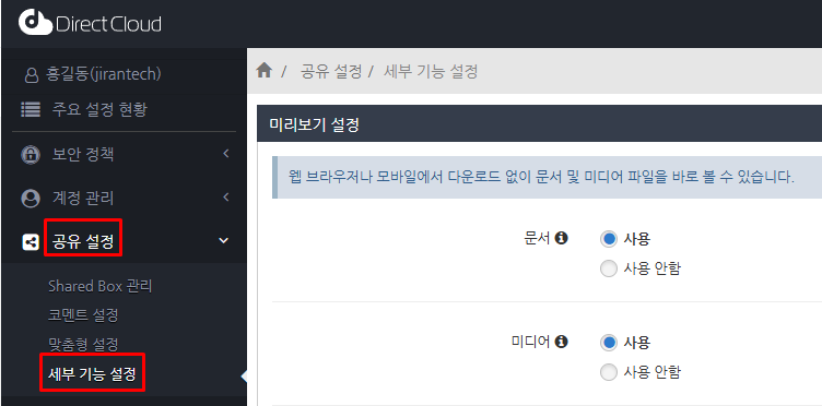 '공유 설정' > '세부 기능 설정' 메뉴를 클릭합니다.