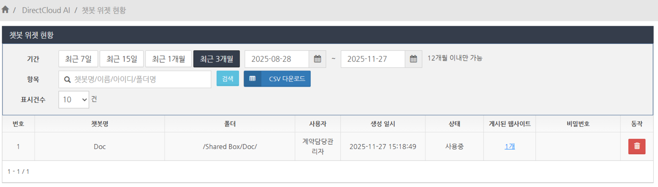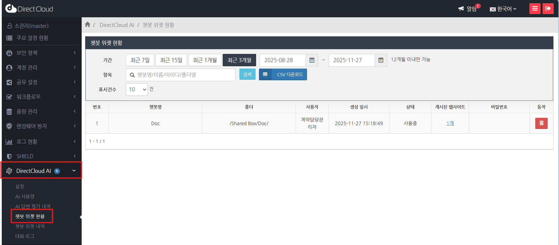 'DirectCloud AI' > '챗봇 위젯 현황' 메뉴를 클릭합니다.
