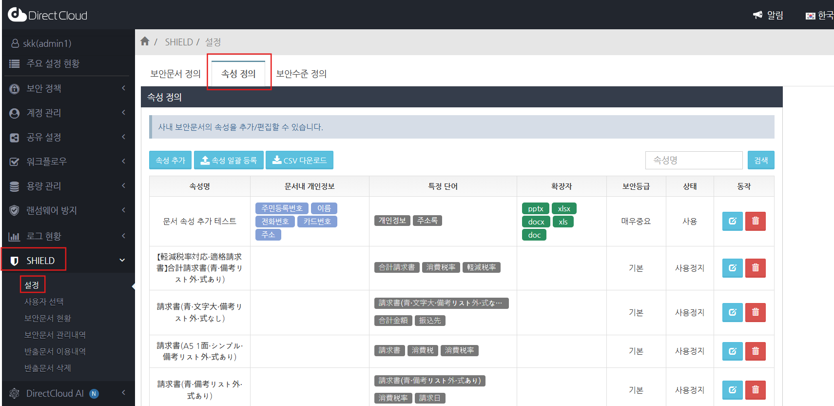 'SHIELD' > '설정' 메뉴를 선택하고 '속성 정의' 탭을 클릭합니다.