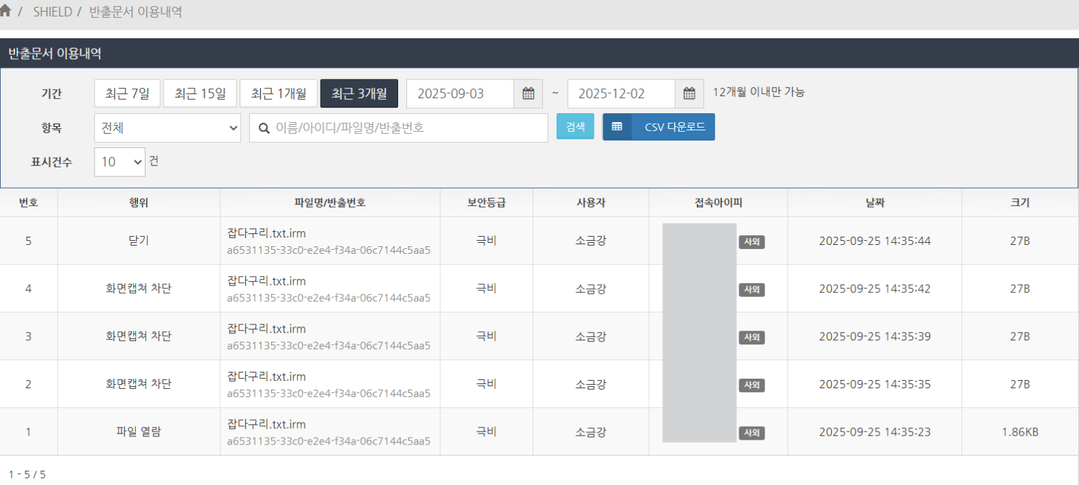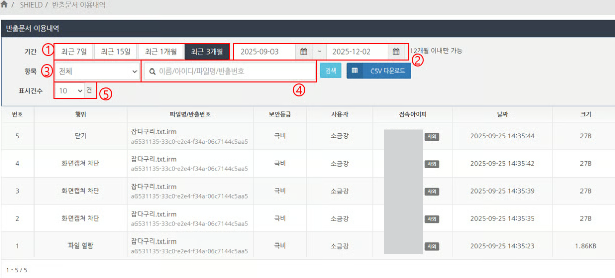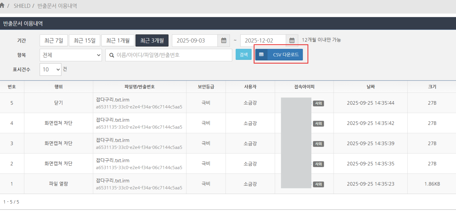 '반출문서 이용내역'에서 CSV 다운로드 버튼을 클릭합니다. 필요한 경우, 반출된 파일의 사용 이력을 먼저 필터링한 뒤 다운로드하시는 것을 권장합니다.