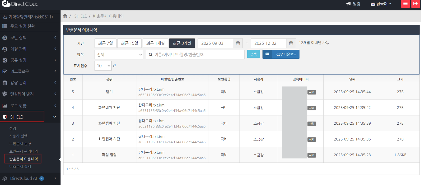 'SHIELD' > '반출문서 이용내역' 메뉴를 클릭합니다.