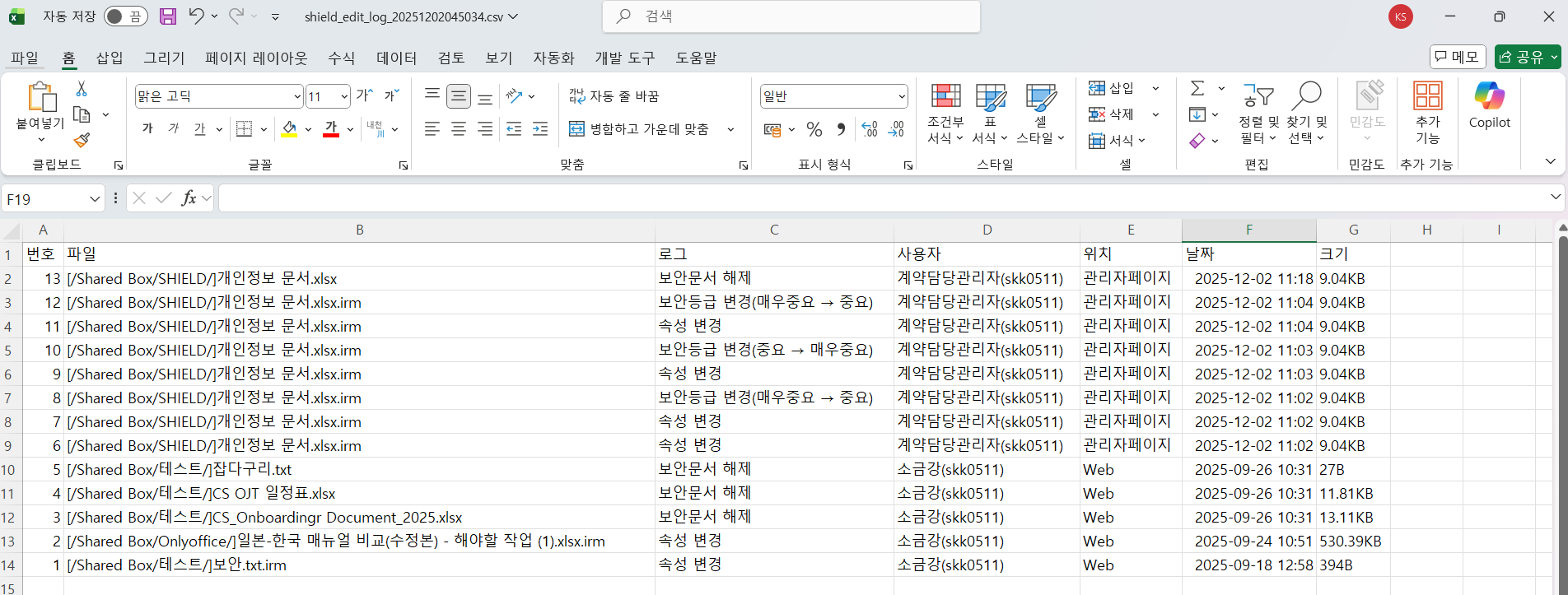속성 변경 로그에는 속성이 변경되기 전의 파일명이 표시됩니다. 또한, 보안등급 변경 로그에는 보안등급이 변경된 이후의 파일명이 표시됩니다.