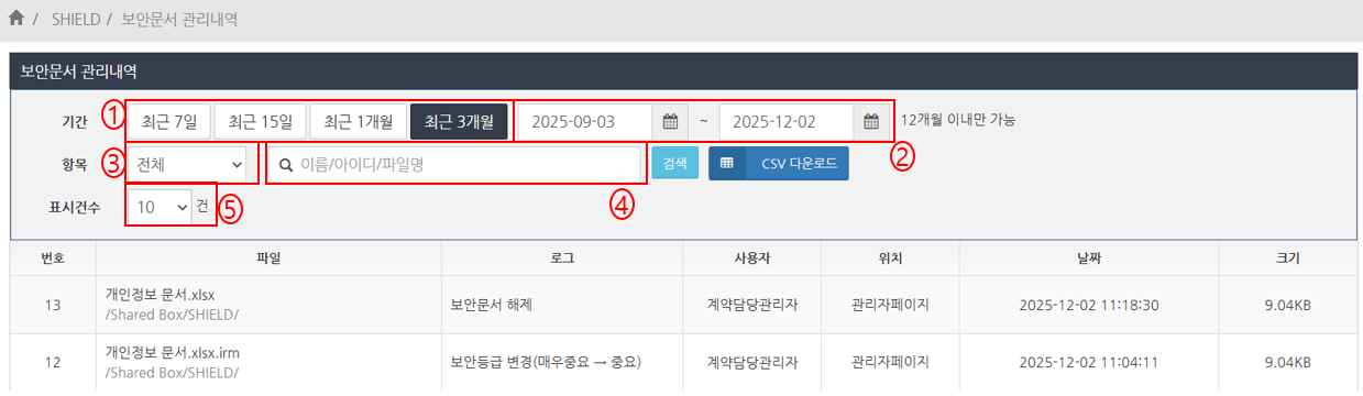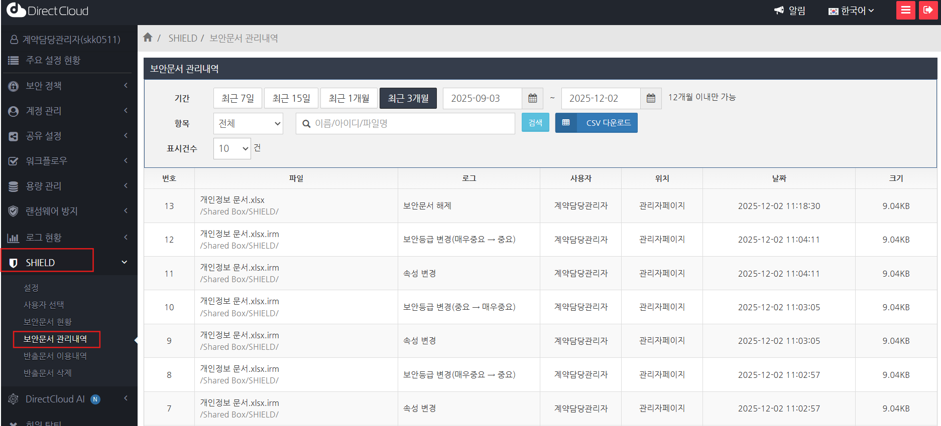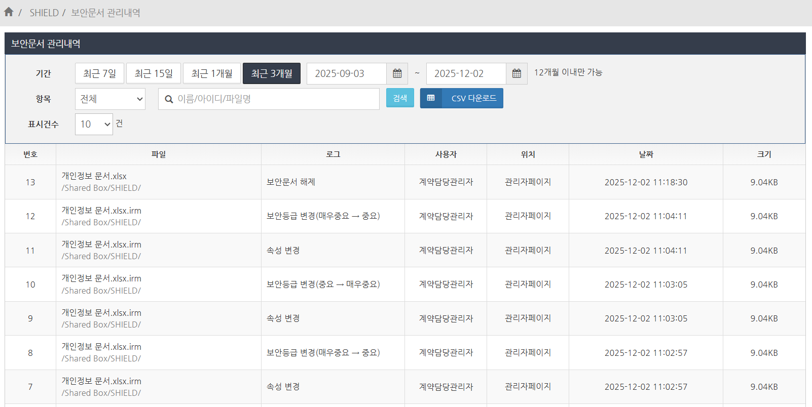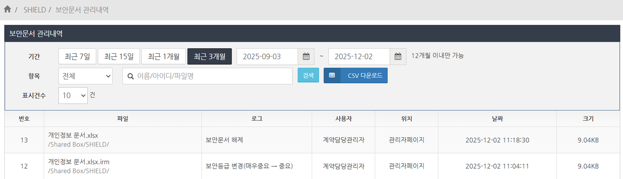 'SHIELD' > '보안문서 관리 내역' 메뉴를 클릭합니다.