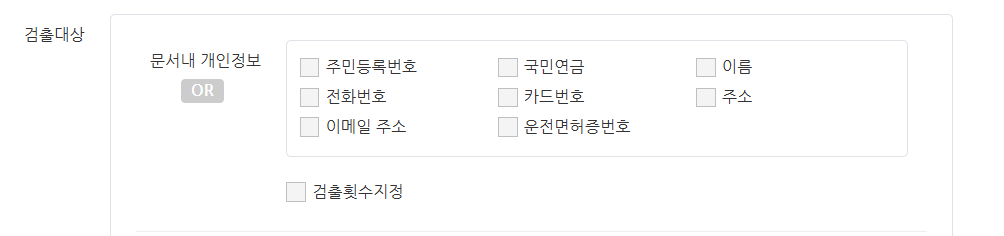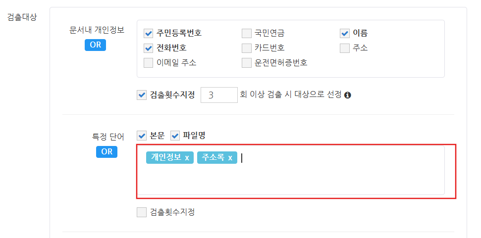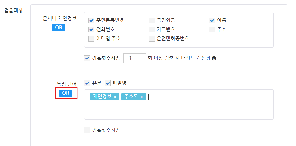텍스트 박스에 여러 단어를 입력한 경우, 활성화된 AND, OR 버튼을 클릭하여 보안 문서의 판정 조건을 변경할 수 있습니다. OR: 선택한 개인 정보 중 하나라도 문서 내 텍스트에 포함된 경우 AND: 선택한 개인 정보가 모두 문서 내 텍스트에 포함된 경우