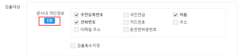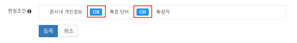 문서 내 개인 정보를 여러 항목 선택한 경우, 활성화된 AND, OR 버튼을 클릭하여 보안 문서의 판정 조건을 변경하실 수 있습니다. OR: 선택한 개인 정보 중 하나라도 문서 내 텍스트에 포함된 경우 AND: 선택한 개인 정보가 모두 문서 내 텍스트에 포함된 경우