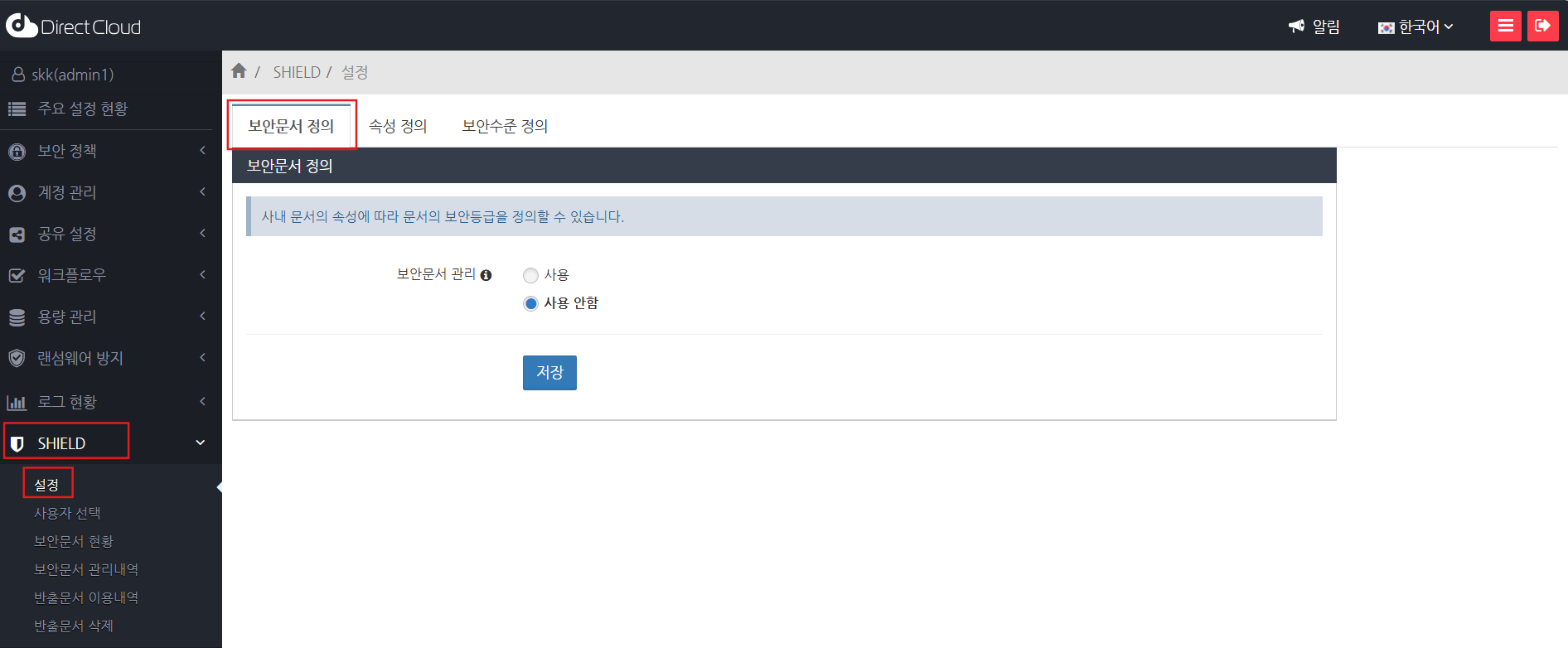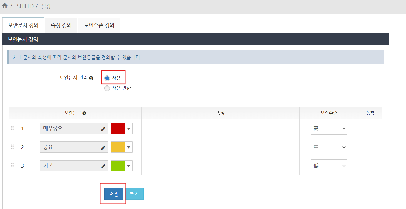 '보안문서 관리'에서 '사용'을 선택하고 저장 버튼을 클릭합니다.