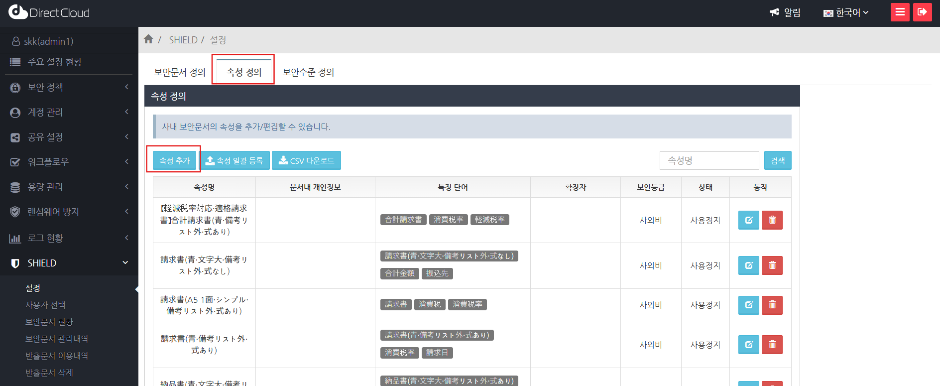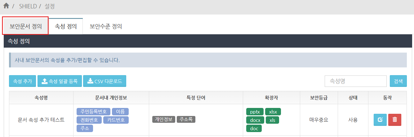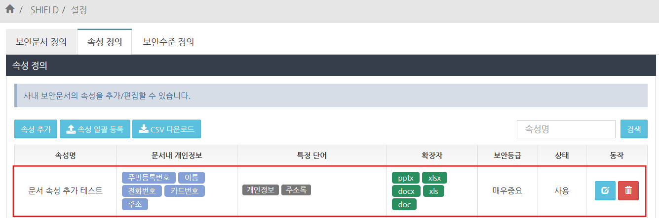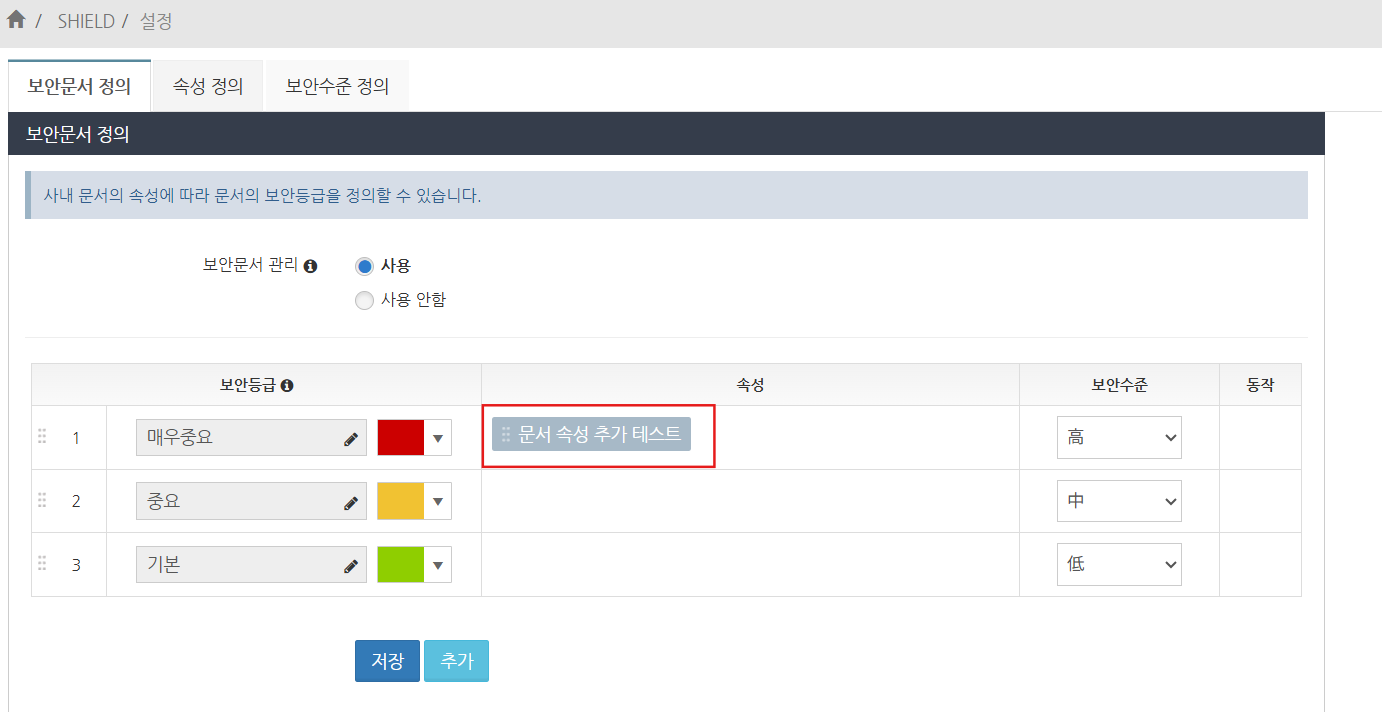 보안문서 정의 화면에서, 등록한 속성명이 설정한 보안등급의 문서 속성 항목에 추가되어 있는지 확인합니다.