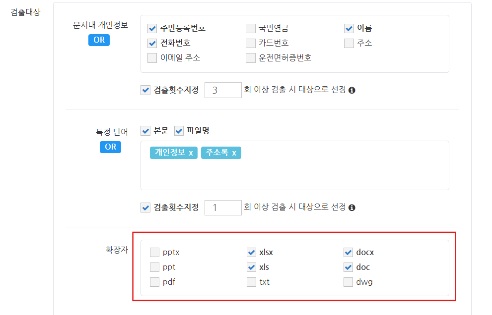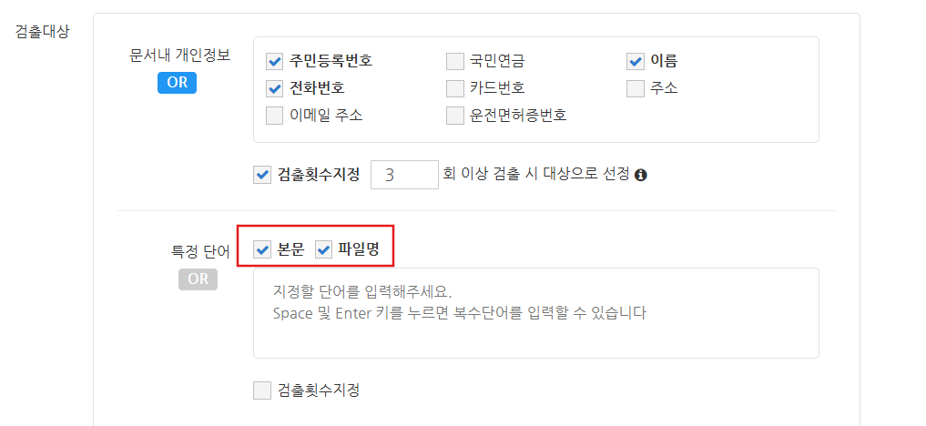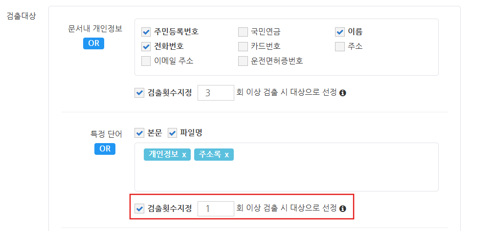 문서의 보안등급을 판정하는 기준이 되는 특정 단어에서 파일명에 체크가 되어 있는 경우, 지정한 단어 중 하나라도 해당되면 보안 문서로 판정되므로 검출 횟수 설정은 표시되지 않습니다.