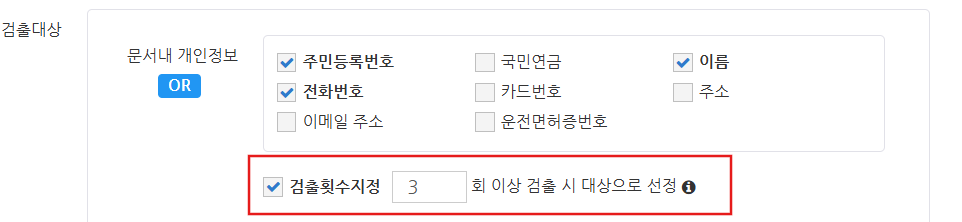 선택한 개인 정보가 문서 내 텍스트에 지정한 수 이상 포함된 경우 보안 문서로 판정하려면, '검출 횟수 지정'에 체크하고 숫자를 입력합니다.
