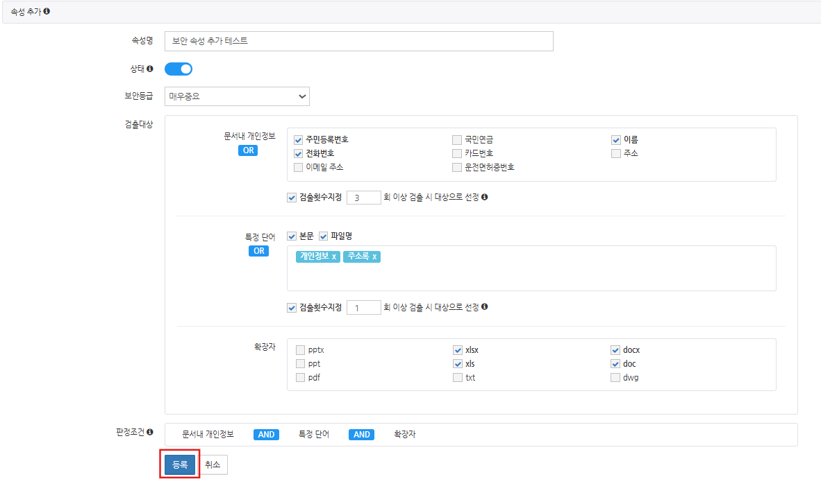 [문서 내 텍스트 또는 파일명에 포함된 단어를 보안등급의 판정 기준으로 설정합니다.]