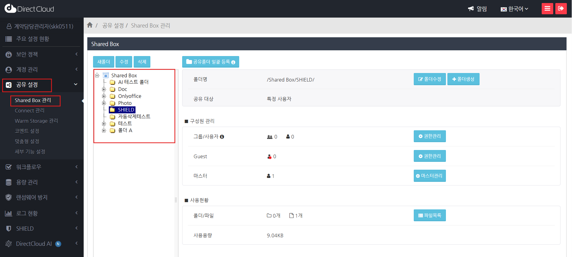 '공유 설정' > 'Shared Box 관리'메뉴를 선택한 후, DirectCloud-SHIELD IRM을 활성화하려는 폴더를 클릭합니다.