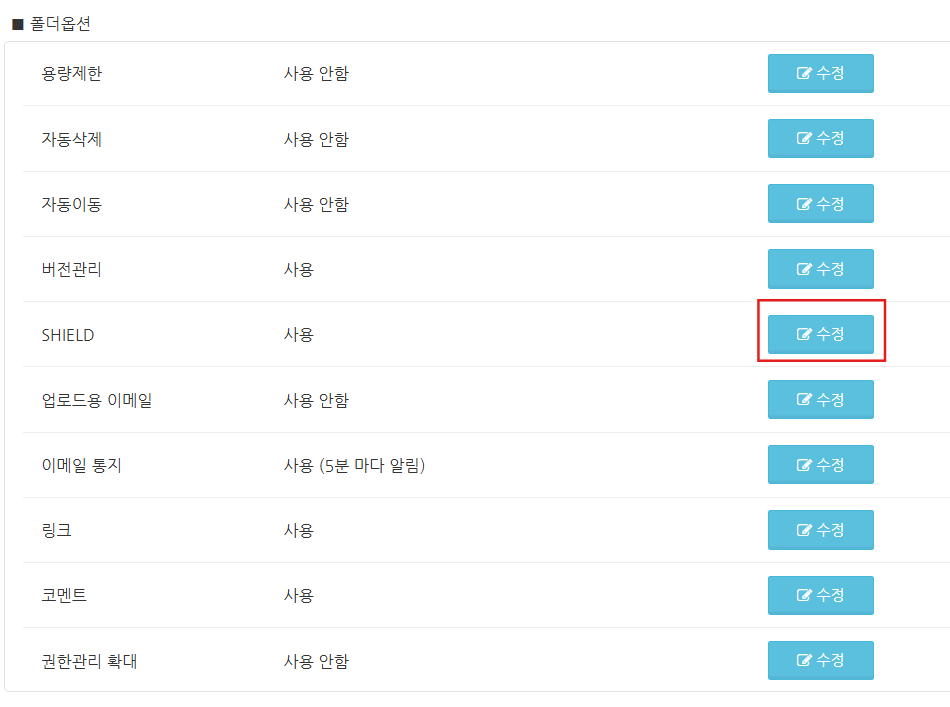 화면을 아래로 스크롤한 후, 폴더 속성 설정에서 SHIELD의 '수정' 버튼을 클릭합니다.