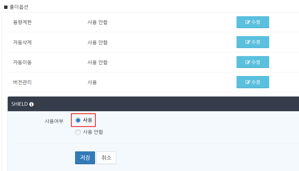 SHIELD 사용여부 설정에서 '사용'을 선택하고 저장 버튼을 클릭합니다.