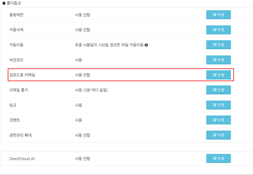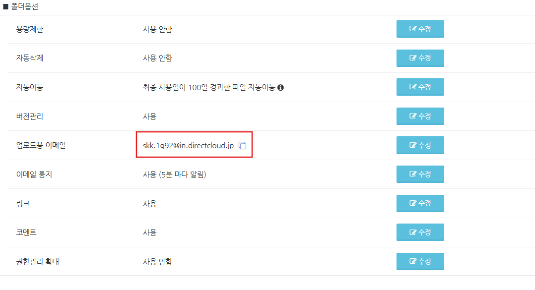 화면을 아래로 스크롤하고 폴더 속성 설정에서 '업로드용 이메일' 설정에서 '수정' 버튼을 클릭합니다.