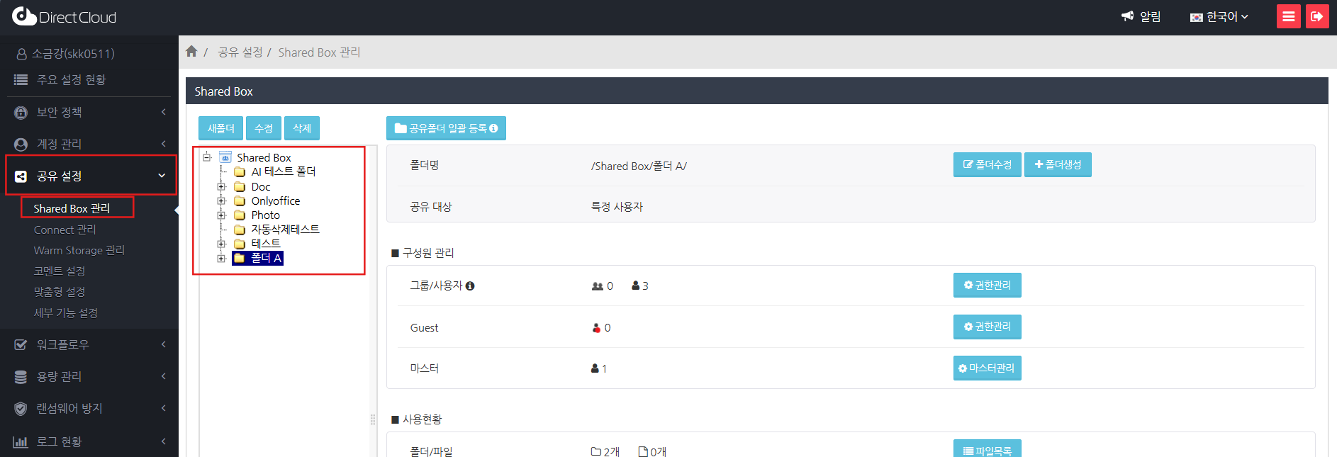 이 매뉴얼에서는 Shared Box 메뉴에서의 설정 방법을 설명하고 있지만, Connect 관리, DLP 관리 메뉴에서도 동일한 절차로 설정할 수 있습니다.