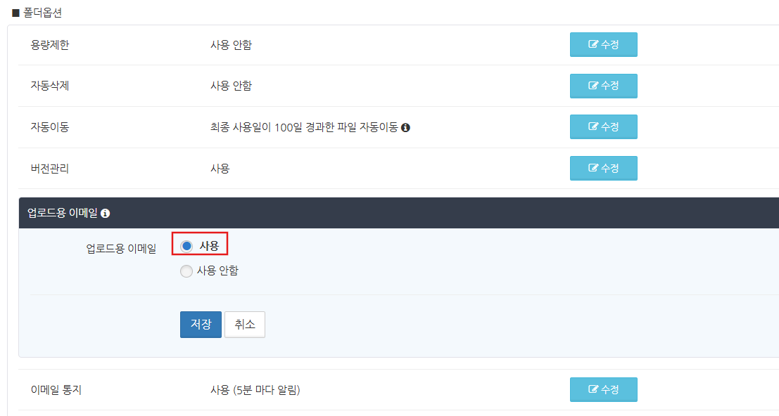 업로드용 이메일에서 '사용'을 선택하고 저장 버튼을 클릭합니다.