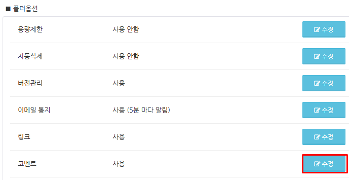 화면을 아래로 스크롤하고 폴더 속성 설정에서 '코멘트'의 '수정' 버튼을 클릭합니다.