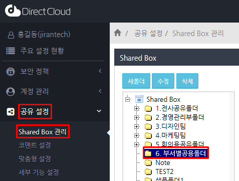 '공유 설정' > 'Shared Box' 관리 메뉴를 선택하고 파일 코멘트를 활성화할 폴더를 클릭합니다.