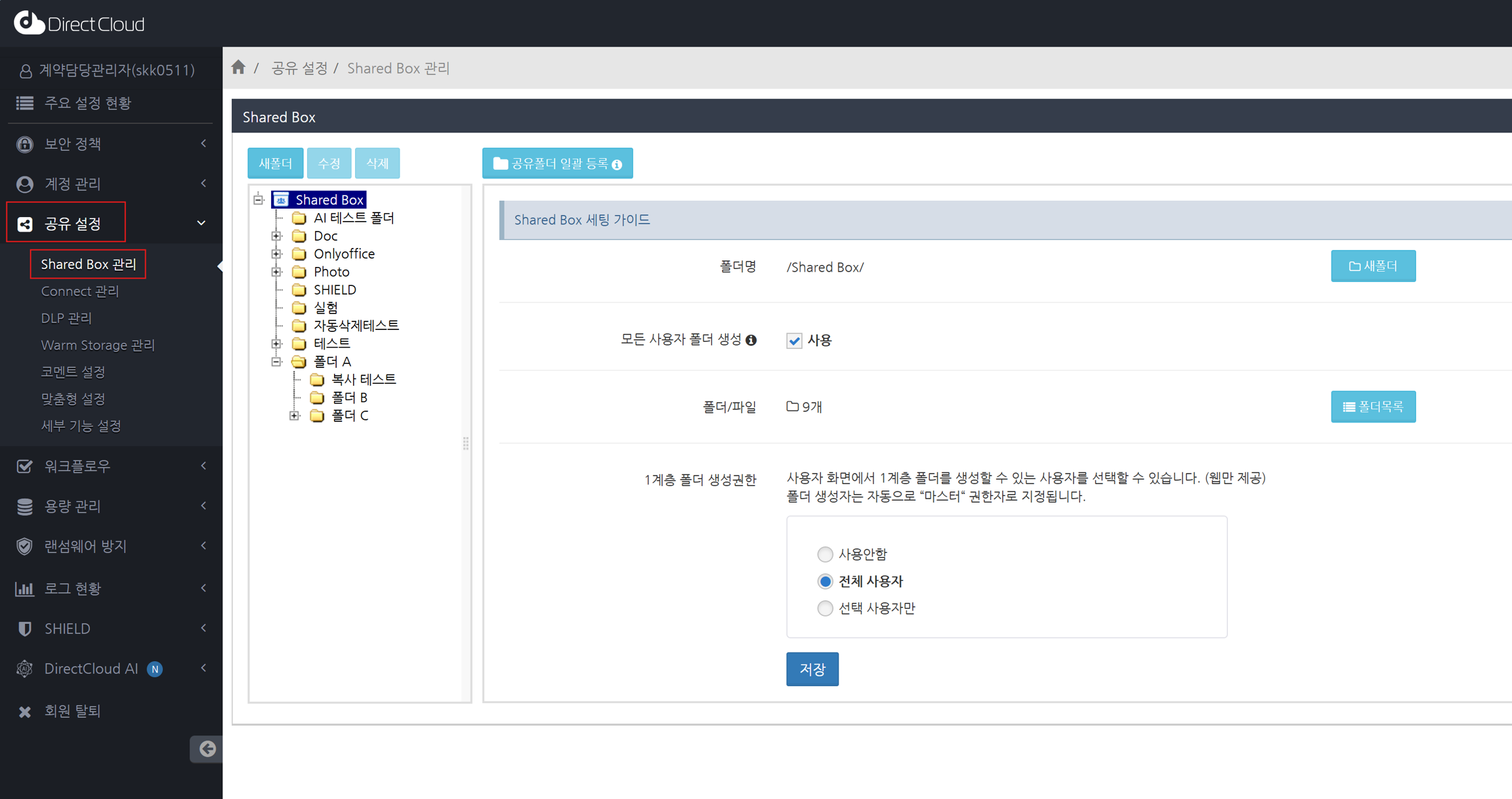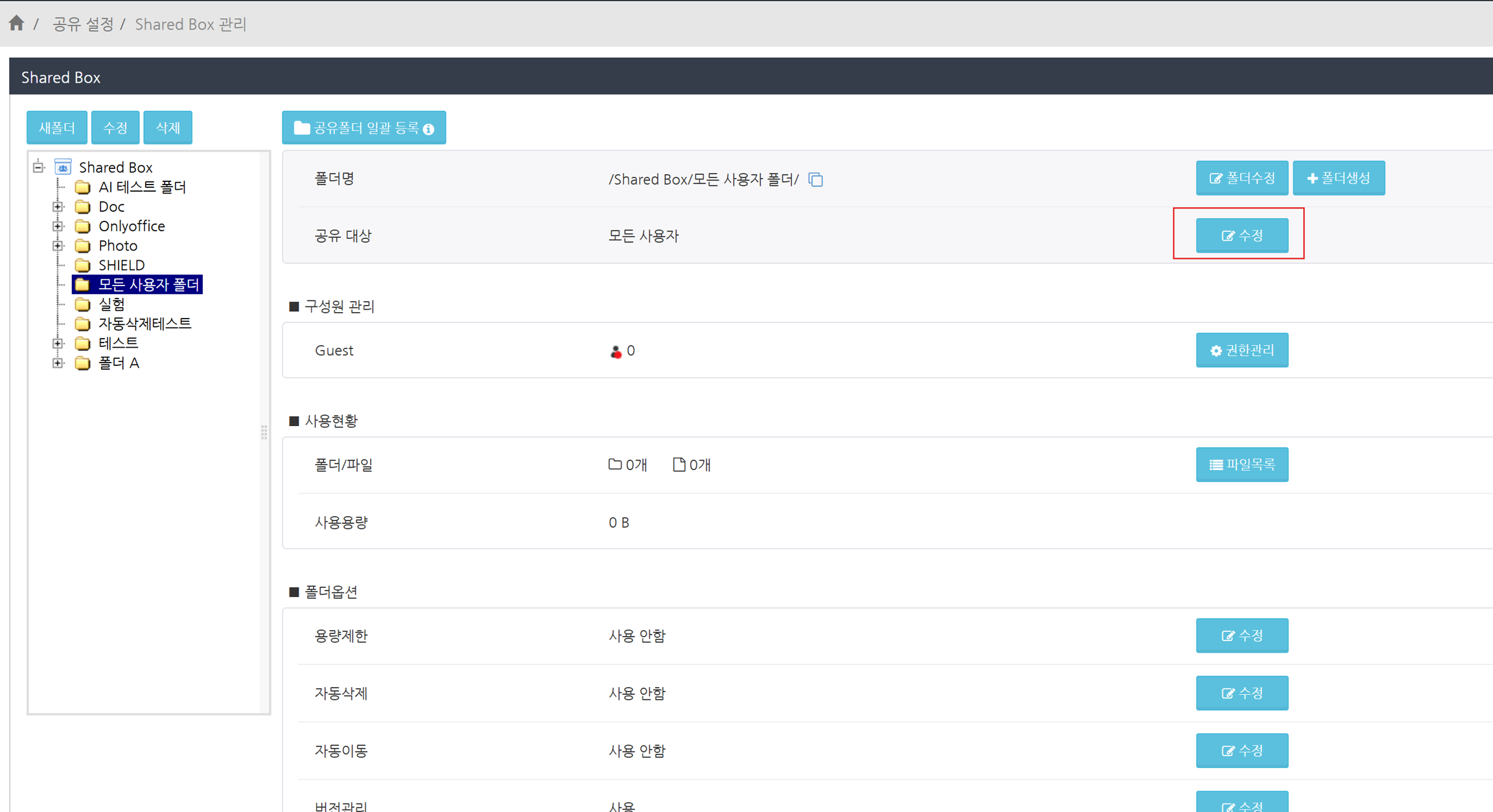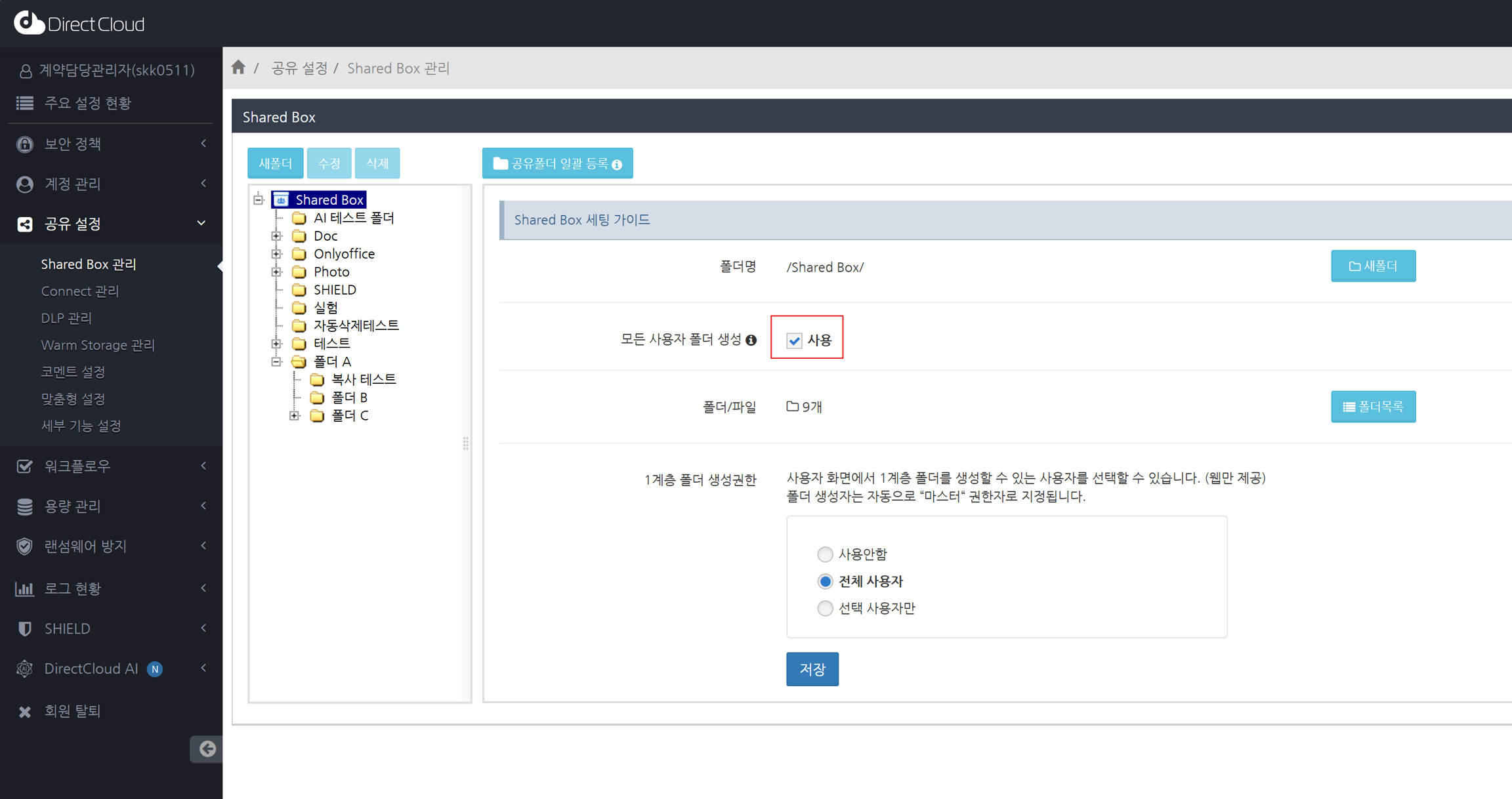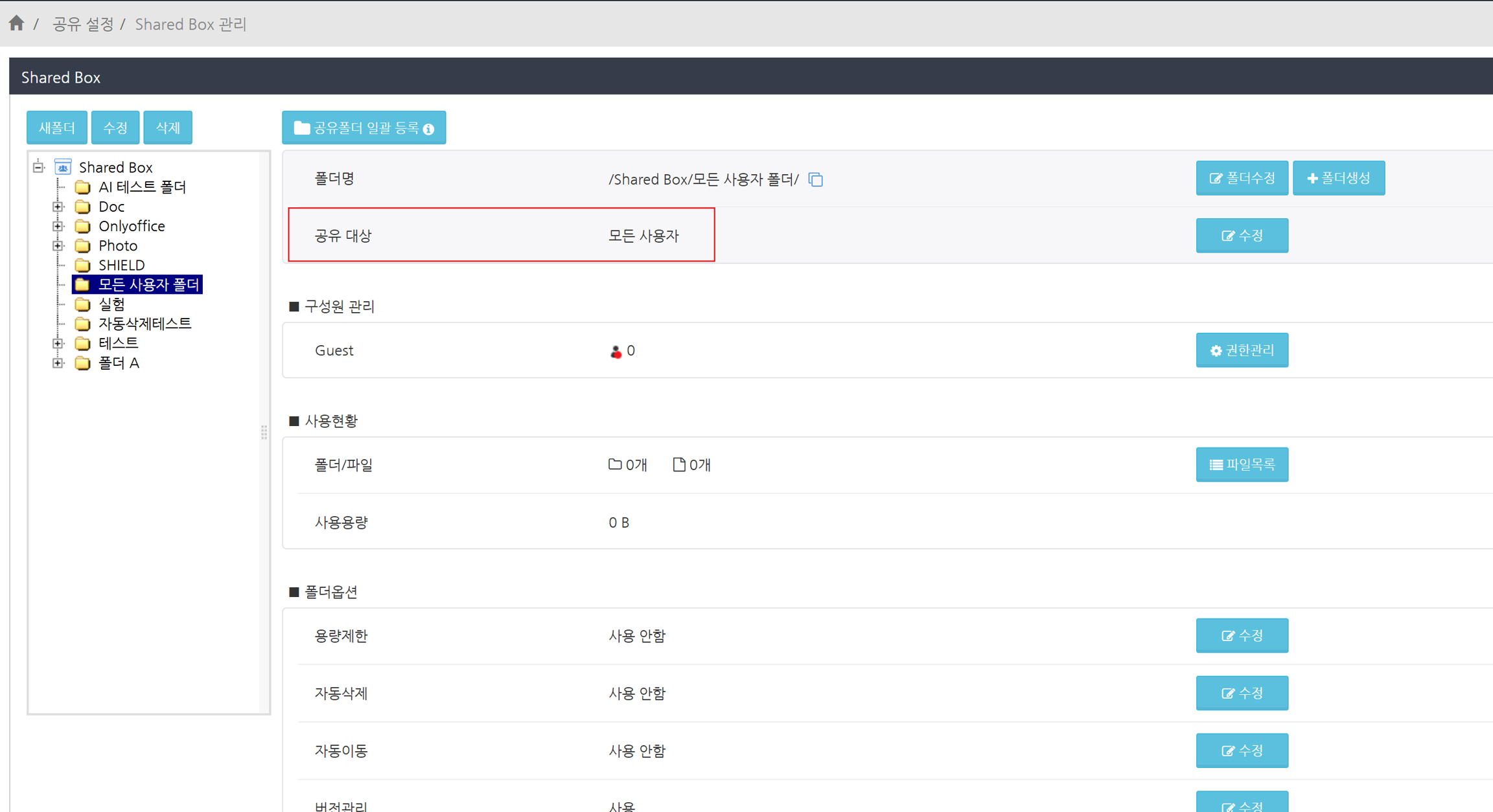 '공유 대상'이 '모든 사용자'인 폴더 생성을 활성화