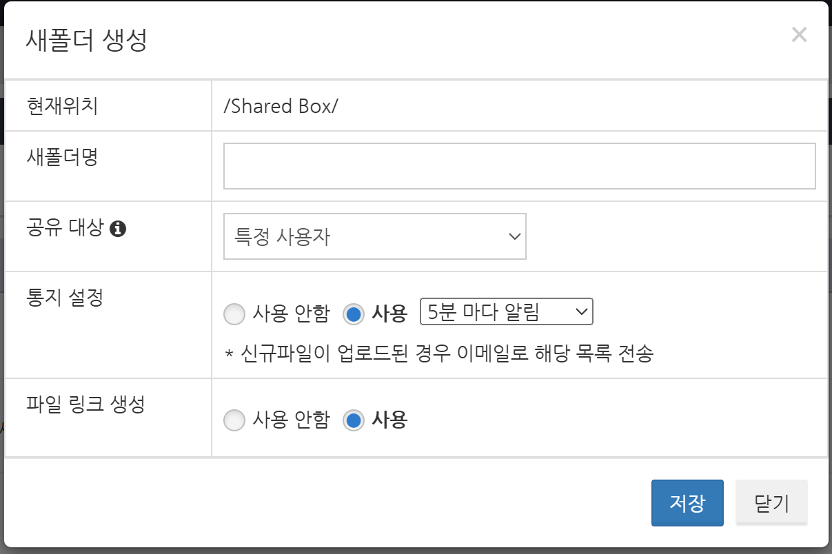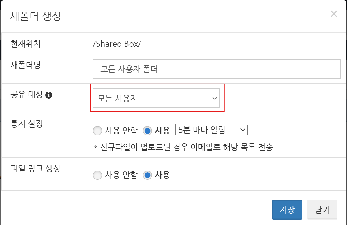 새 폴더의 이름을 입력하고 '공유대상'에서 '모든 사용자'를 선택하고 저장 버튼을 클릭합니다.