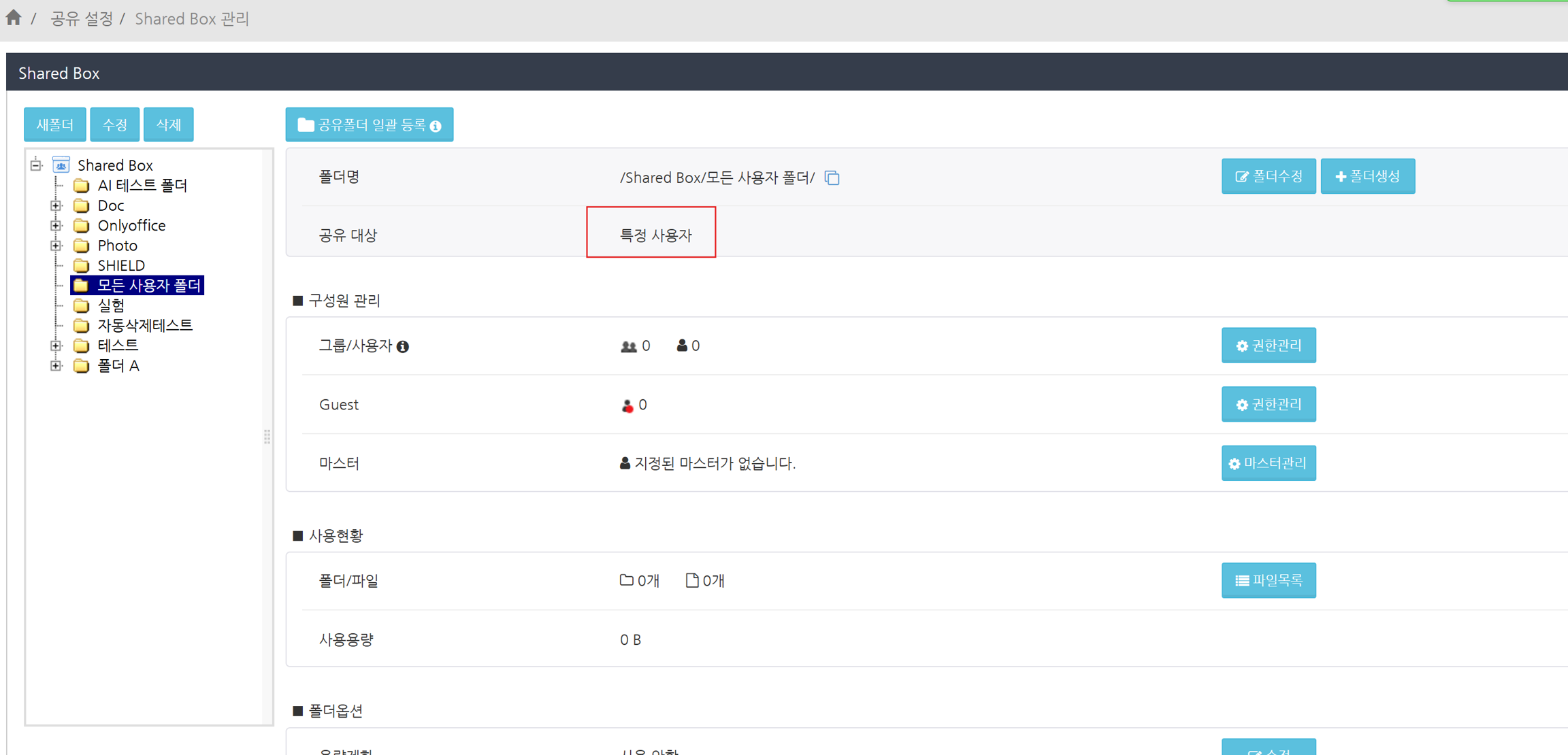 '공유 대상'이 '모든 사용자'인 폴더에서는 모든 사용자가 <전체권한>으로 고정되므로, <마스터>의 '접근 권한 설정' 버튼은 표시되지 않습니다.