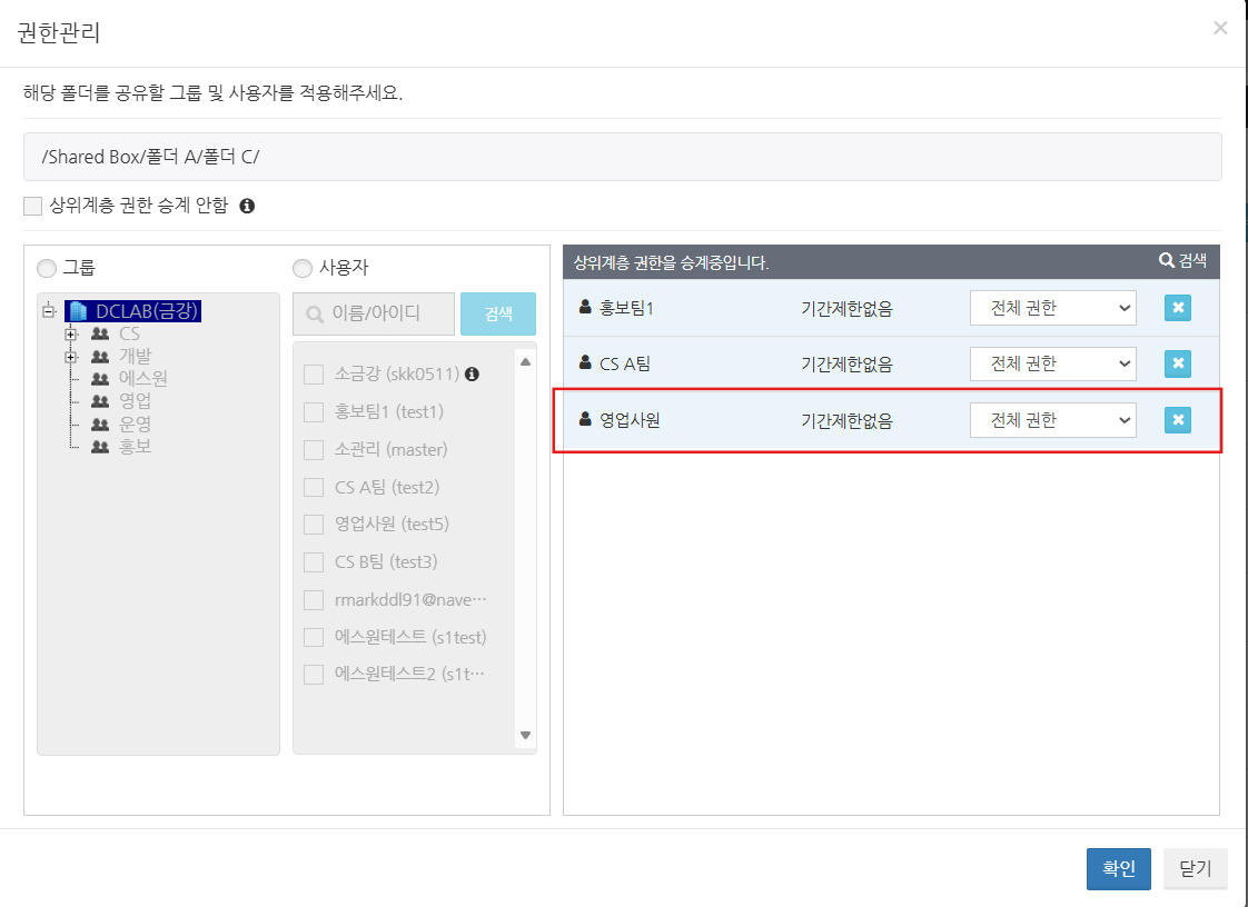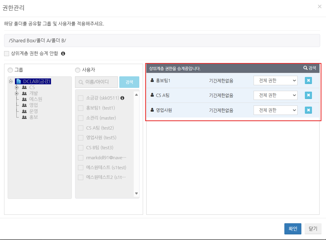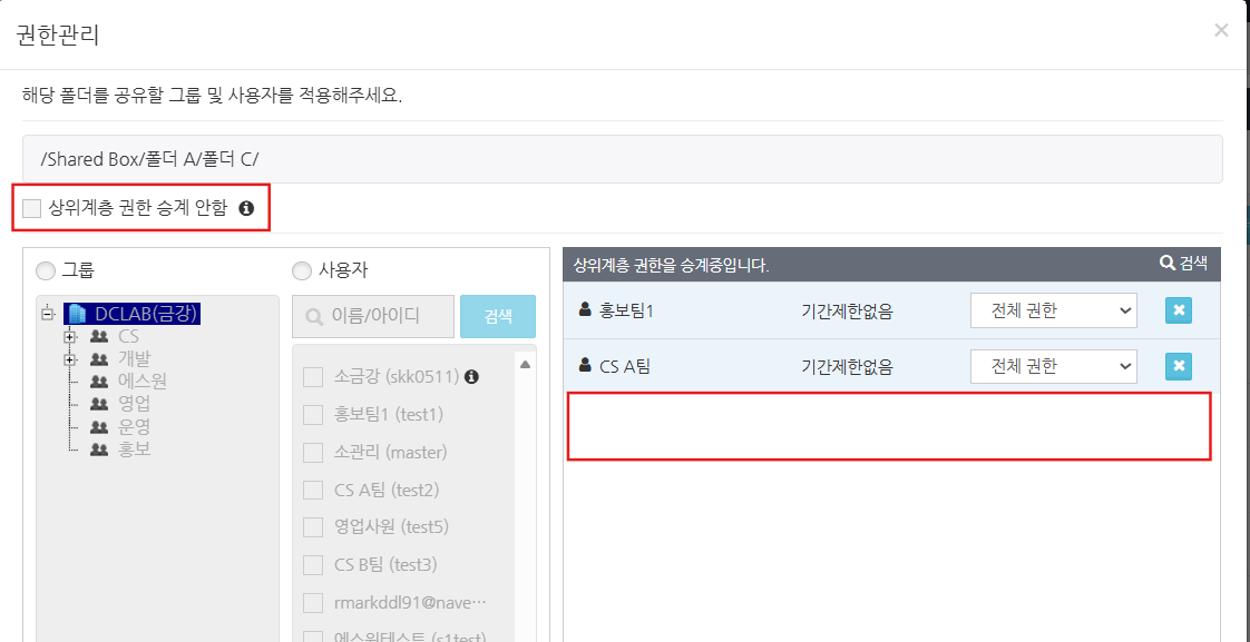 상위에서 설정한 폴더의 접근 권한이 하위 폴더에 반영되며, 사용자의 접근 권한은 삭제된 상태로 유지됩니다.