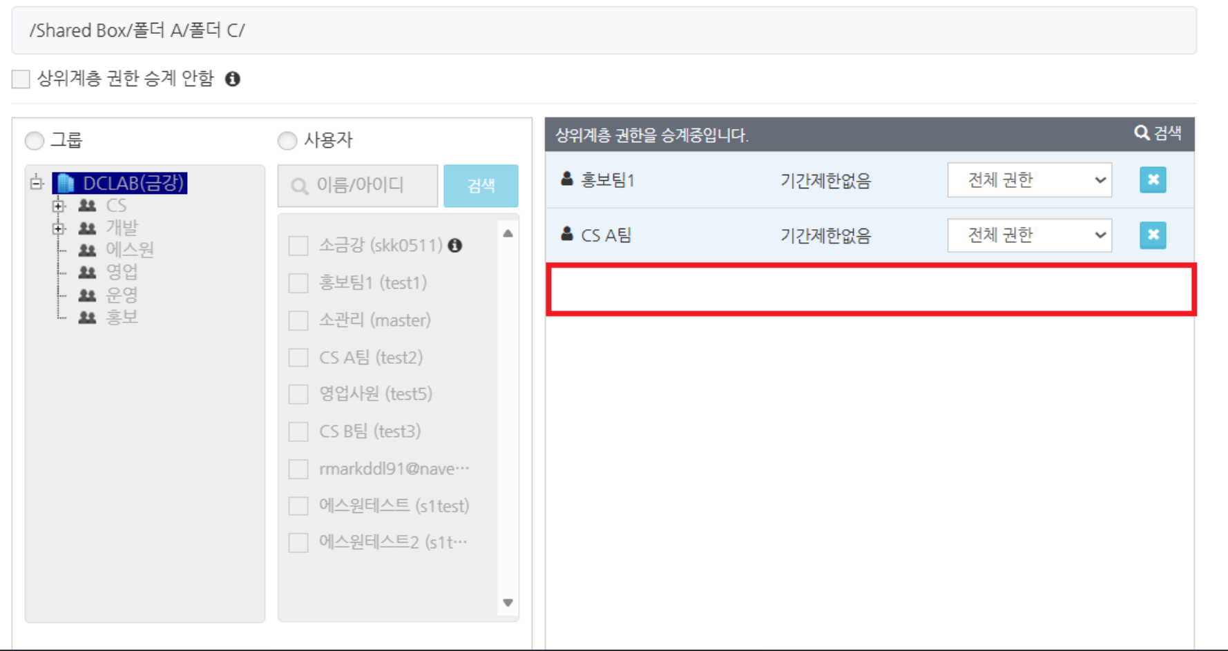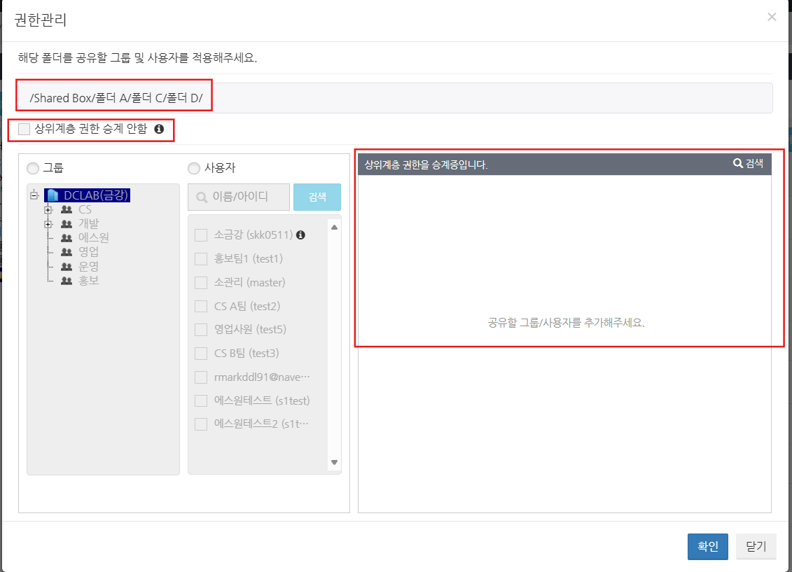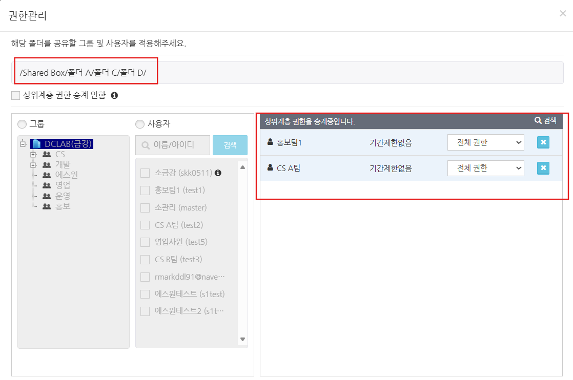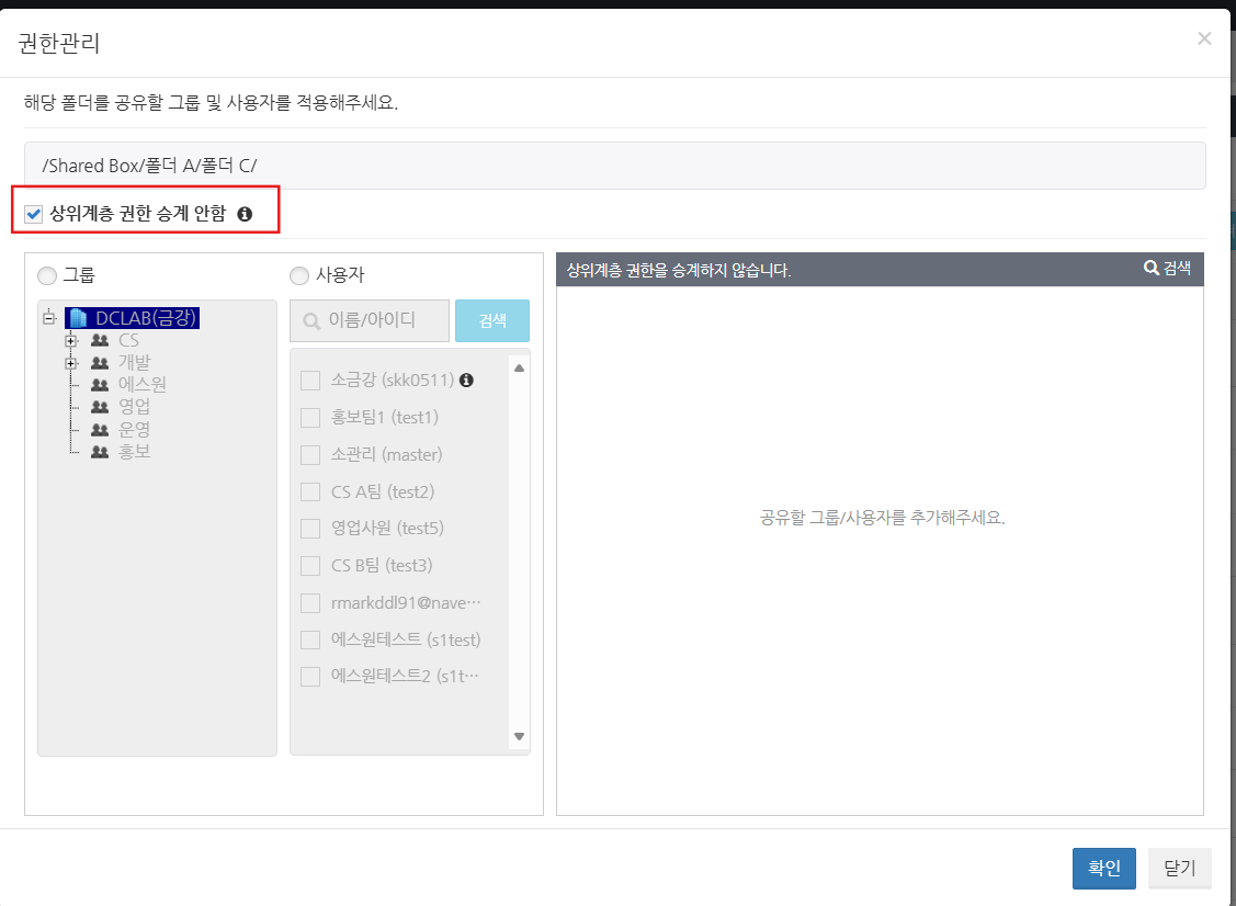 상위에서 설정한 폴더의 접근 권한이 하위 폴더에 반영됩니다.