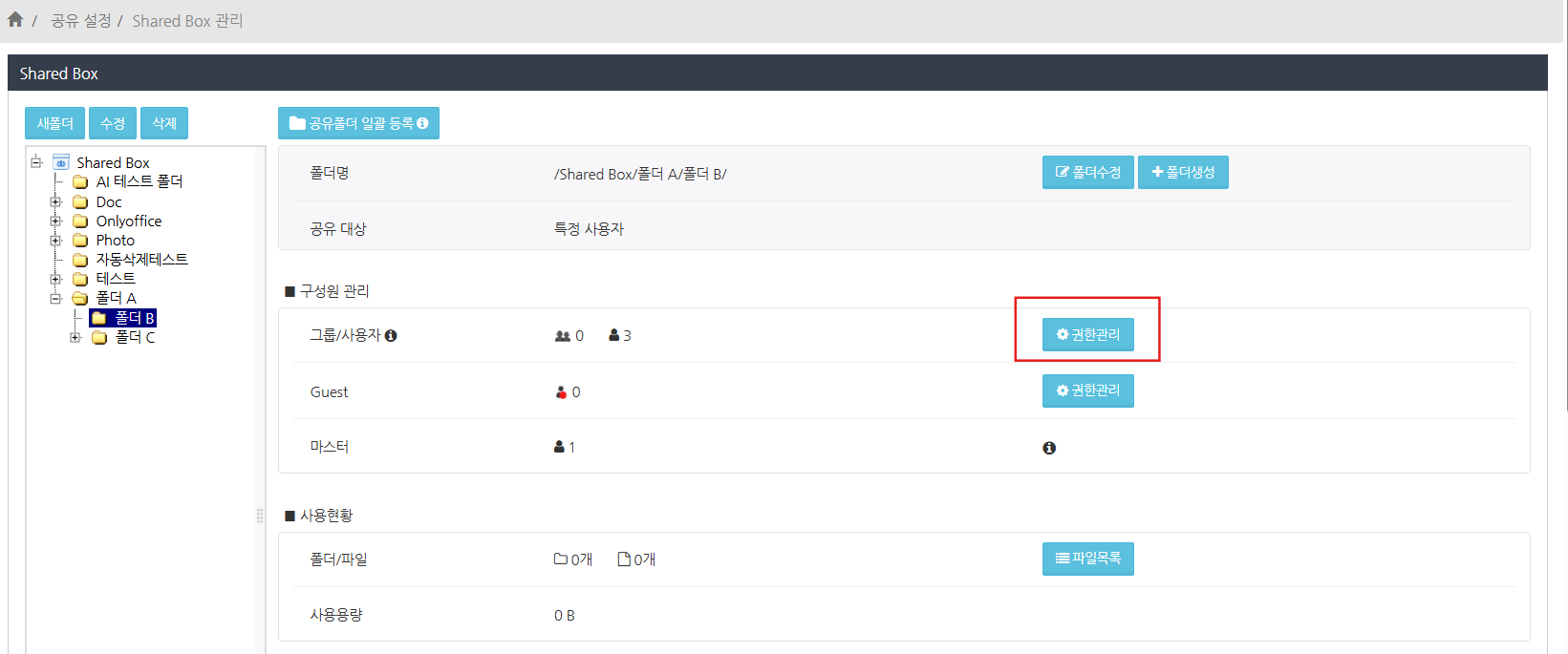 '공유 설정' > 'Shared Box' 관리 메뉴를 선택하고 권한을 상속하지 않으려는 폴더를 클릭합니다.
