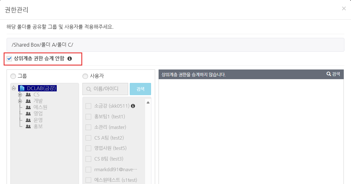 사용자 접근 권한 설정 화면에서 '상위계층 권한 승계 안함'에 체크되어 있는 경우에는 상위 폴더의 접근 권한이 상속되지 않습니다. 오른쪽 영역에서 접근 권한 설정 표시가 사라지고, '상위계층 권한을 승계하지 않습니다.' 라고 표시됩니다. 이때의 접근 권한 상태는 다음과 같습니다: