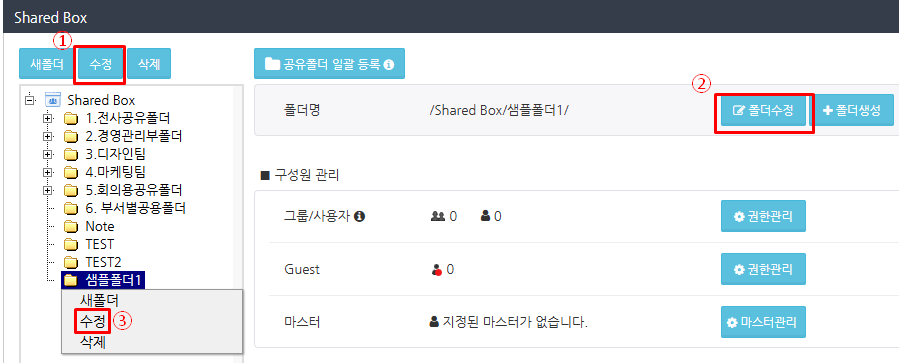 ❶ 왼쪽 상단에 있는 '수정' 버튼을 클릭 ❷ '공유 설정'의 '폴더 이름' 오른쪽에 있는 '폴더 수정' 버튼을 클릭 ❸ 폴더 트리에서 이름을 변경하려는 폴더를 오른쪽 클릭한 후, 표시된 메뉴에서 '수정'을 클릭