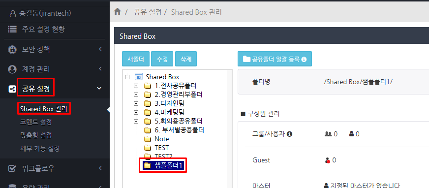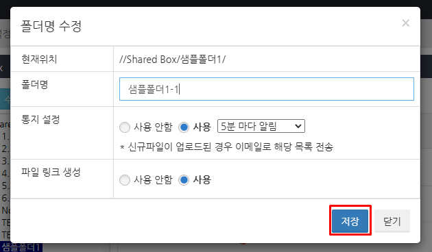 '공유 설정' > 'Shared Box' 관리 메뉴를 선택하고 폴더 이름을 변경할 폴더를 클릭합니다.