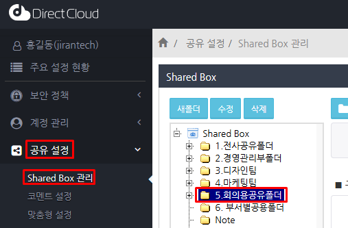 '공유 설정' > 'Shared Box 관리' 메뉴를 선택하고 자동 삭제를 설정할 폴더를 클릭합니다.