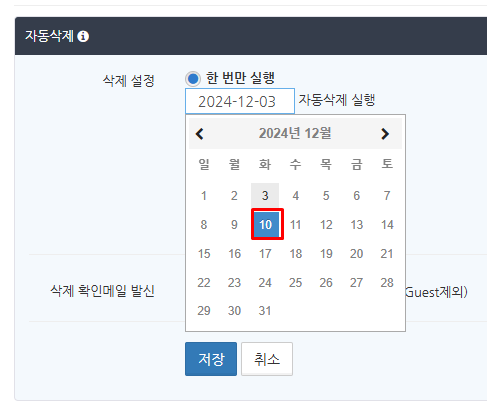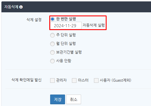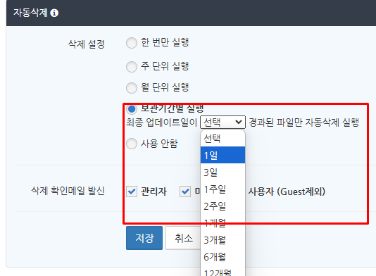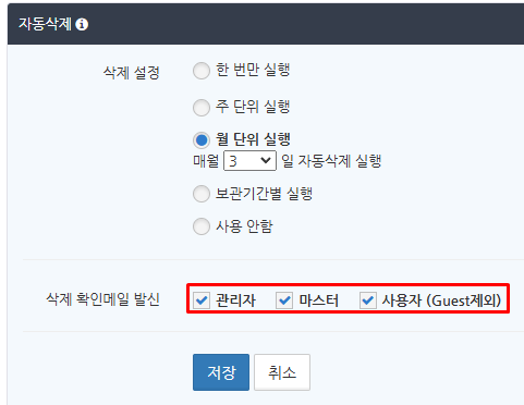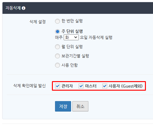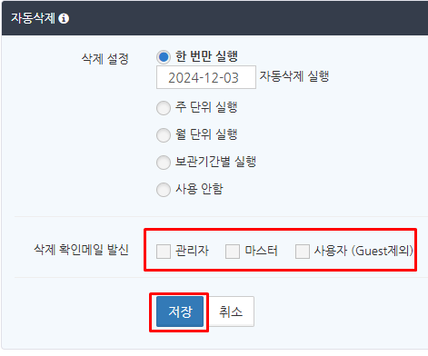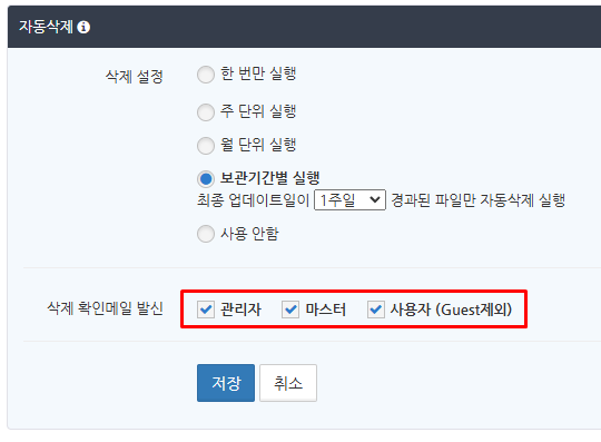 자동 삭제 알림 메일을 보내는 대상으로 '관리자', '마스터', '사용자 (Guest제외)'에 하나 이상 체크를 넣고 '저장' 버튼을 클릭합니다.
