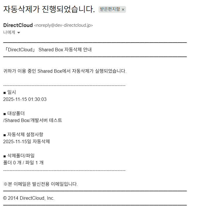 파일이 삭제되면 '삭제 확인메일 발신'에서 체크를 한 사용자에게 "자동삭제가 진행되었습니다." 라는 제목의메일이 전송됩니다.