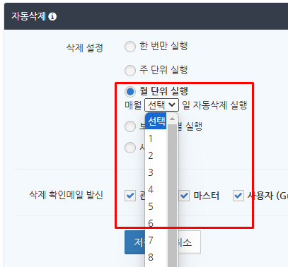 자동 삭제에서 '월 단위 실행'을 선택하고 자동 삭제할 날짜를 선택합니다.
