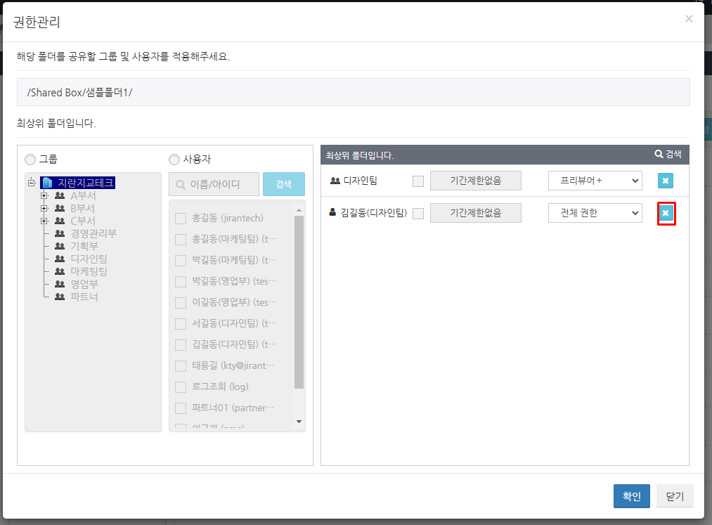 권한을 삭제할 그룹 또는 사용자의 '×' 버튼을 클릭합니다. 오른쪽 영역에서 그룹 또는 사용자가 삭제됩니다.