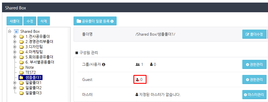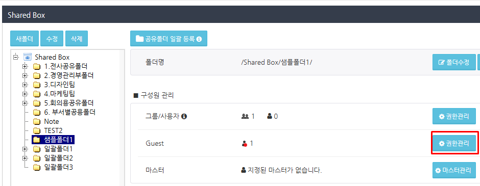Shared Box 설정 화면의 '구성원 관리'에서 Guest 오른쪽에 표시되는 '권한관리' 버튼을 클릭합니다. Guest 권한 설정 화면이 표시됩니다.