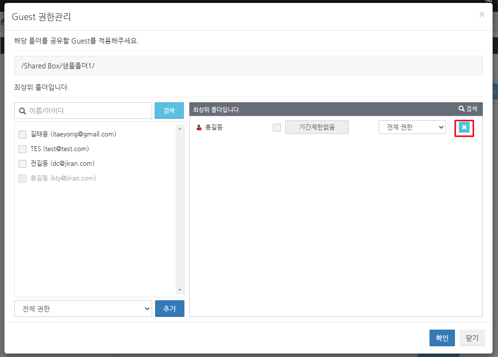 권한을 삭제할 Guest의 '×' 버튼을 클릭합니다. 오른쪽 영역에서 Guest가 삭제됩니다.