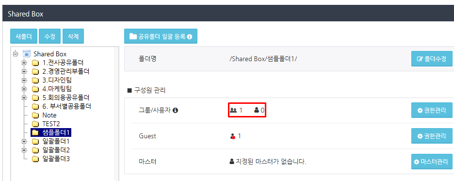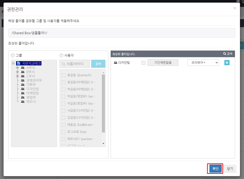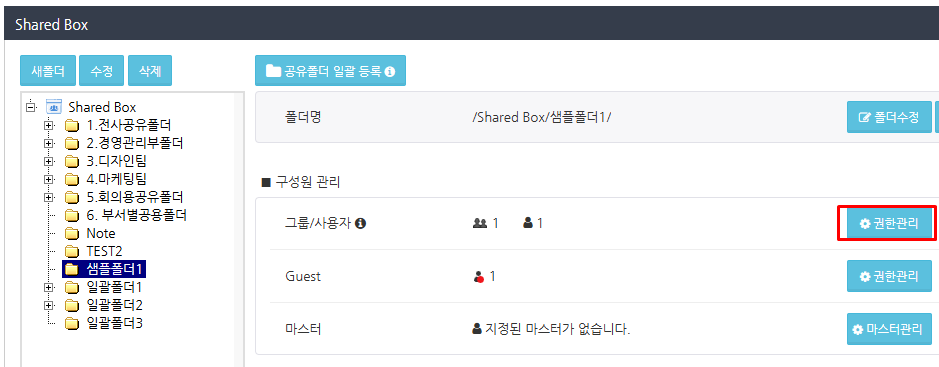 Shared Box 설정 화면의 '구성원 관리'에서 그룹/사용자의 오른쪽에 표시되는 '권한관리' 버튼을 클릭합니다. 권한 설정 화면이 표시됩니다.