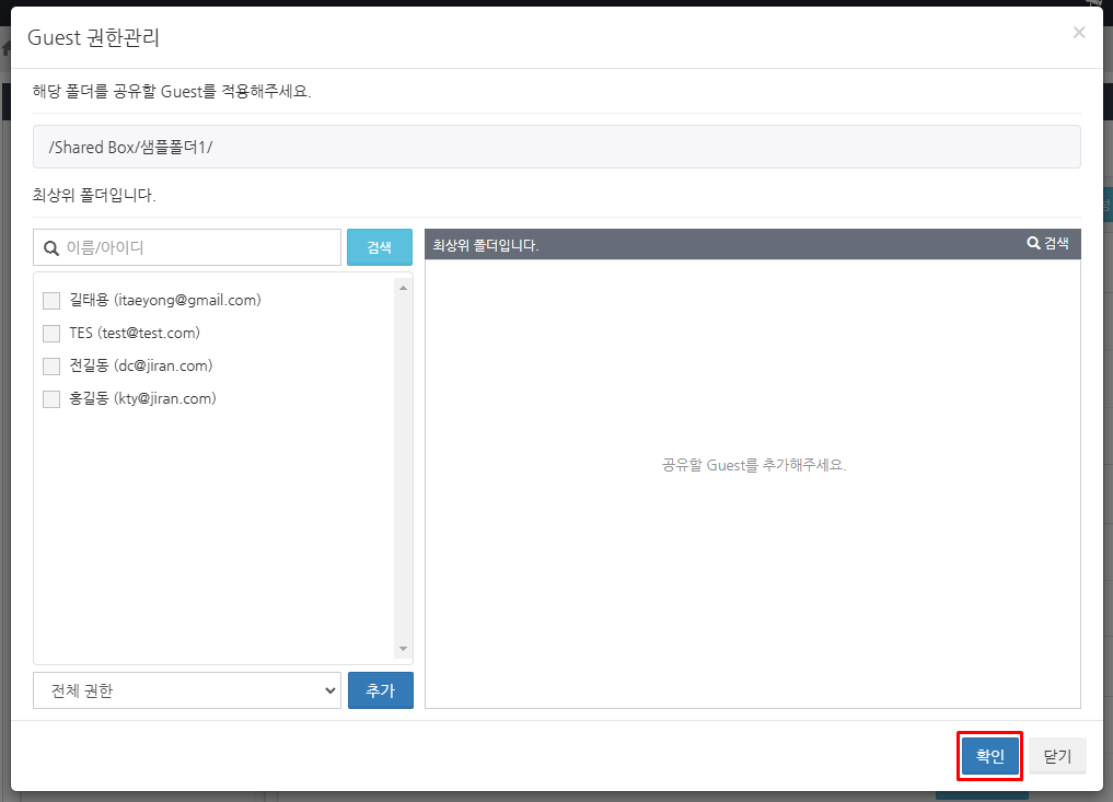 확인 버튼을 클릭합니다. 권한 설정이 저장됩니다.