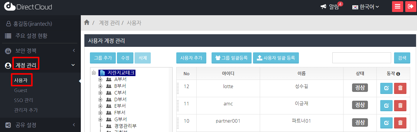 '계정 관리' > '사용자' 메뉴를 선택합니다.