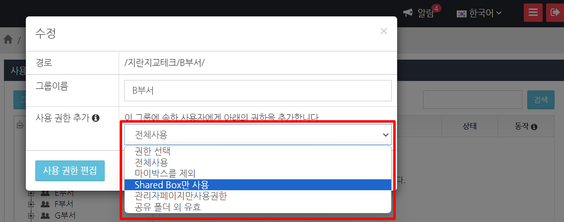 ‘Shared Box’, ‘링크’, ‘업로드 요청’ 기능 제한이 할당된 ‘B부’